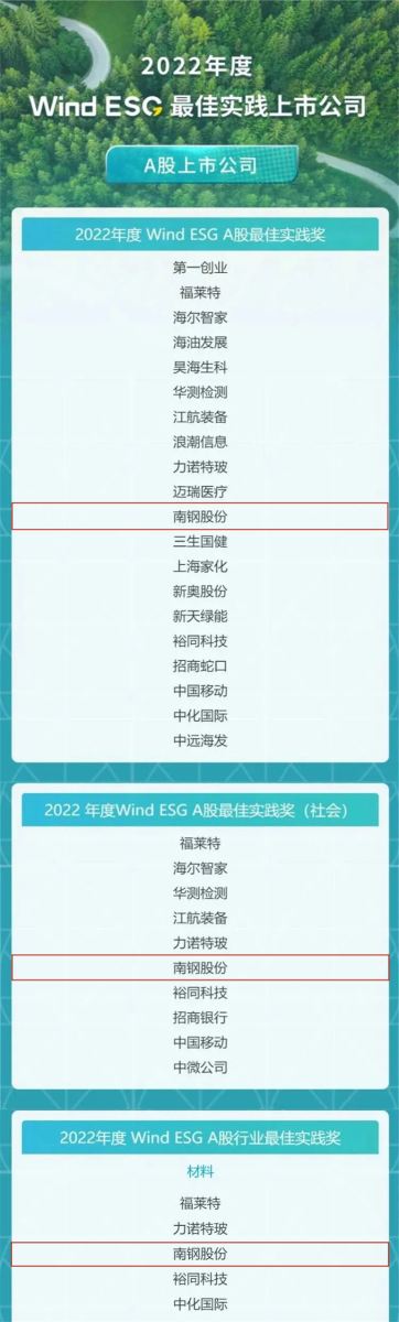 1月10日,“2022年度Wind ESG最佳實(shí)踐上市公司”獲獎(jiǎng)名單揭曉,南鋼股份(600282.SH)憑借在ESG(環(huán)境、社會(huì)和公司治理)實(shí)踐方面優(yōu)異表現(xiàn),獲評(píng) “2022年度 Wind ESG A股最佳實(shí)踐獎(jiǎng)”、“2022年度 Wind ESG A股最佳實(shí)踐獎(jiǎng)(社會(huì))”和“2022年度 Wind ESG A股行業(yè)最佳實(shí)踐獎(jiǎng)(材料)”三項(xiàng)大獎(jiǎng),是鋼鐵行業(yè)唯一上榜企業(yè)。