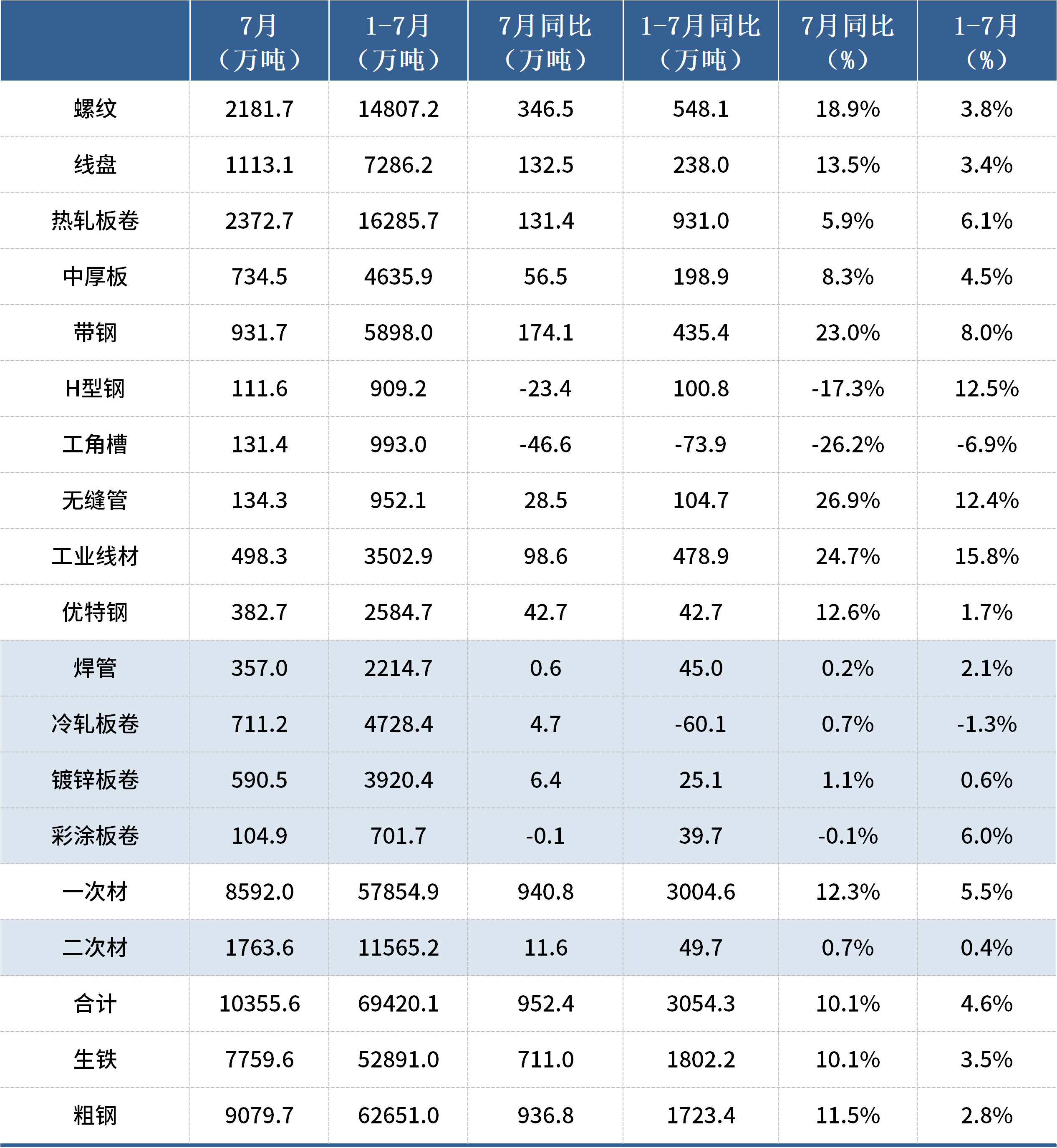 根據鋼聯調研數據顯示,1-7月,大樣本內鋼廠一次材產量累計69420萬噸,同比增長3054.3萬噸,增幅4.6%;其中五大材累計產量47743萬噸,同比增長1856萬噸;五大材之外的帶鋼、型鋼、無縫管和工業線材等也有較大幅度的增長。