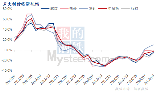 但中長期看,作為建材消費的大戶,房地產市場將繼續表現偏弱。雖然下半年,各個城市開始陸續推行“認房不認貸”的信貸政策,但房地產對鋼材需求主要集中在前端的新開工和中間的施工環節,而前述政策主要在后端的消費環節發力,土地成交數據才是未來建材消費能否轉變的核心觀察指標。2023 年第 35 周,全國 100 大中城市推出土地規劃建筑面積 2380 萬平方米,成交土地規劃建筑面積 1276 萬平方米,同比下降 61%。從這個數據看,建材消費保持低迷的局面不會有大的改變。