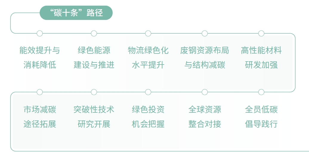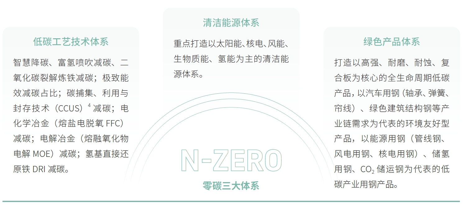 公司全面梳理鋼鐵行業應對氣候變化的技術清單,以源頭減碳、過程降碳和末端固碳為總體思路,實施“碳十條”行動綱要和六條技術路線。此外,公司重點構建“N-ZERO”零碳三大體系,推動公司從“碳冶金”邁向“零碳冶金”,從“碳流程”轉變為“無碳流程”。“N-ZERO”零碳三大體系與“碳十條”路徑相互配合,共同構成公司“雙碳”工作頂層發展框架。