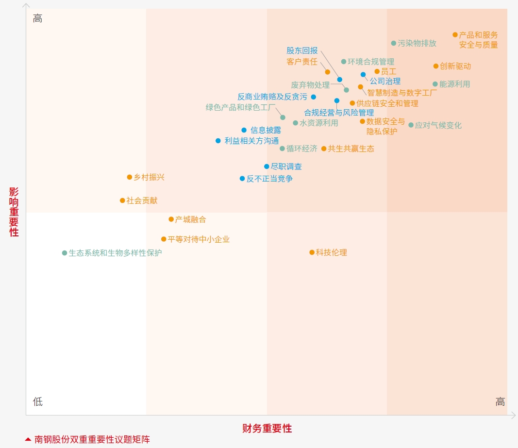 南鋼股份設立“環境友好、治理一流、科創引領、共生共贏”的 ESG 戰略目標,著力提升 ESG 管理水平,聚焦“創新發展與卓越產品、共享發展與員工成長、綠色發展與環境友好、公司治理與共贏發展、和諧關系與社會責任”五大可持續發展層面,為員工謀幸福、為顧客謀發展、為股東增回報、為社會擔責任、為相關方創共贏,致力于實現“創建國際一流受尊重的企業智慧生命體”的企業愿景。
